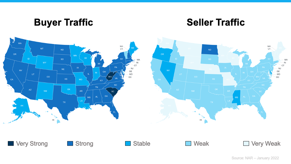 The latest buyer and seller activity data from the National Association of Realtors (NAR) indicates buyer traffic heavily outweighs seller traffic today, as shown in the maps below. There are far darker blues (strong buyer activity) on the left and much lighter blues (weak seller activity) on the right. In other words, this shows how the demand for homes is significantly greater than what’s available to purchase.